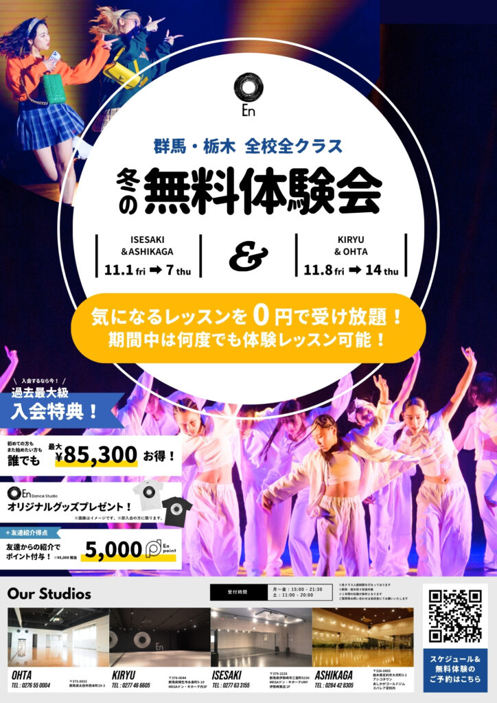 ・NACCHAN育成クラスのみ体験は可能ですが、在籍するためにはEn Dance Studio群馬・栃木校で育成クラスを含む2レッスン以上通っていただくことが条件となります。