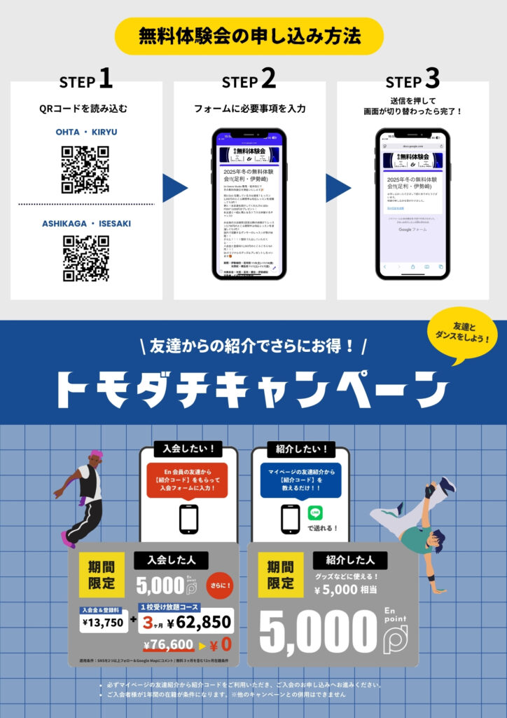 ・NACCHAN育成クラスのみ体験は可能ですが、在籍するためにはEn Dance Studio群馬・栃木校で育成クラスを含む2レッスン以上通っていただくことが条件となります。